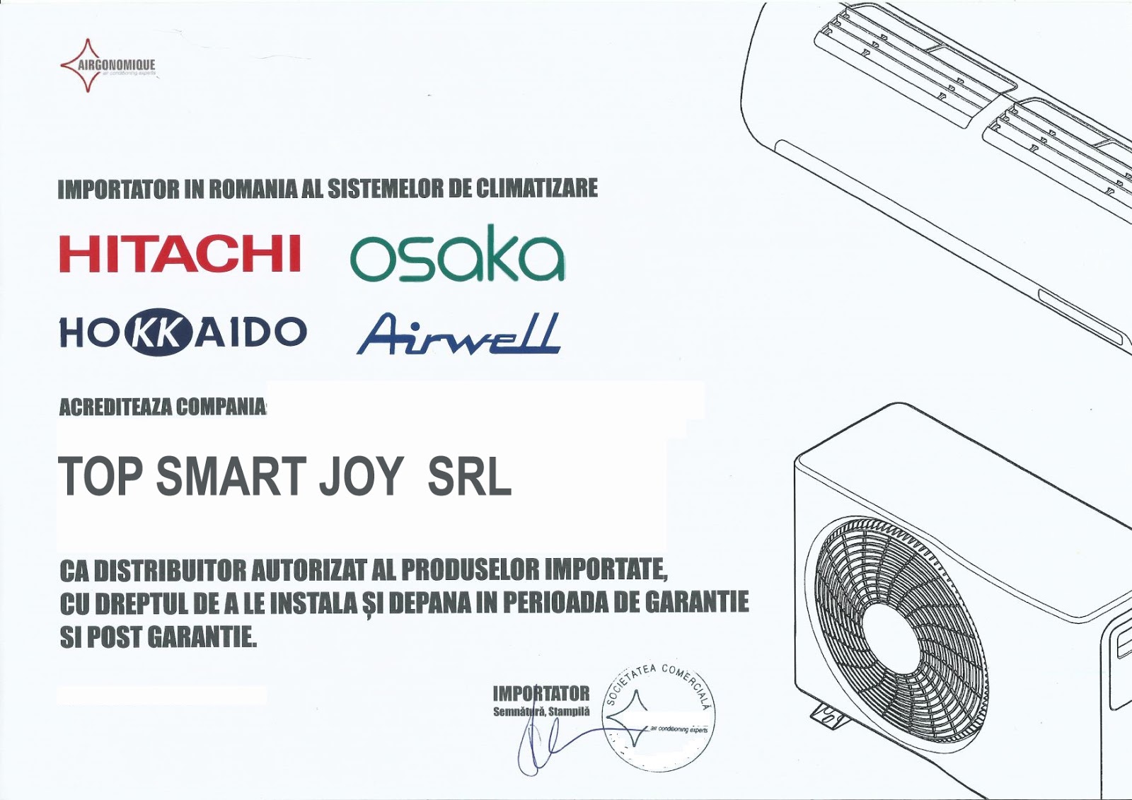 - Certificari sisteme de climatizare Hitachi , Yoki , Osaka , Midea , Airwell , Hokkaido